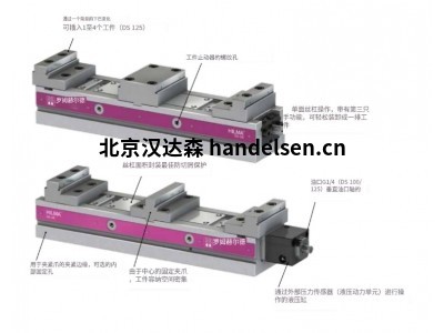 機(jī)械虎鉗,雙夾緊系統(tǒng) DS,由機(jī)械或液壓操作,用于單夾緊和排夾緊。它們有一個(gè)頂爪,可水平或垂直安裝,通過(guò)浮動(dòng)中心夾爪最多可夾持 4 個(gè)工件。帶第三只手功能的單側(cè)導(dǎo)螺桿操作使工件的裝卸更加方便。鉗口寬度包括 100、125 和 125 L(毫米)。